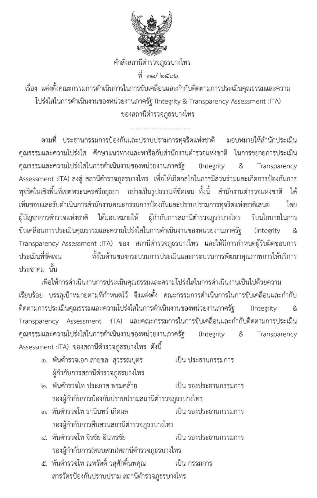 ตัวชี้วัดที่ 10.1 การดำเนินการเพื่อป้องกันการทุจริต / ITA 24 / การมีส่วนร่วมของหัวหน้าสถานีตำรวจ การป้องกันและลดโอกาสการทุจริต