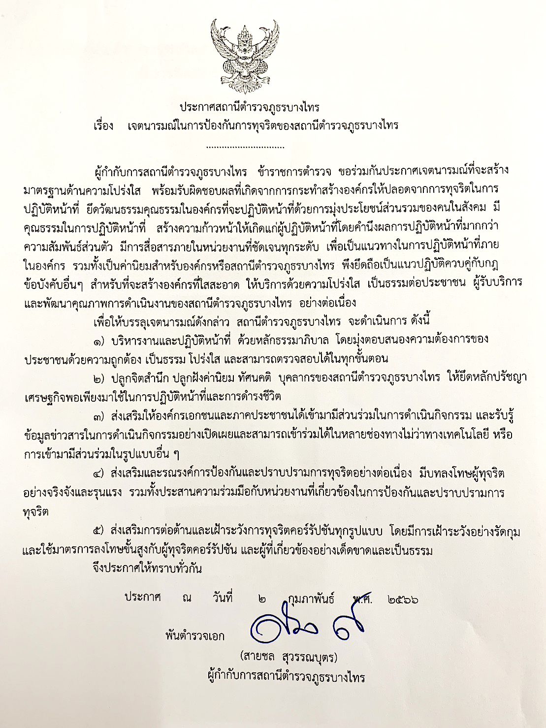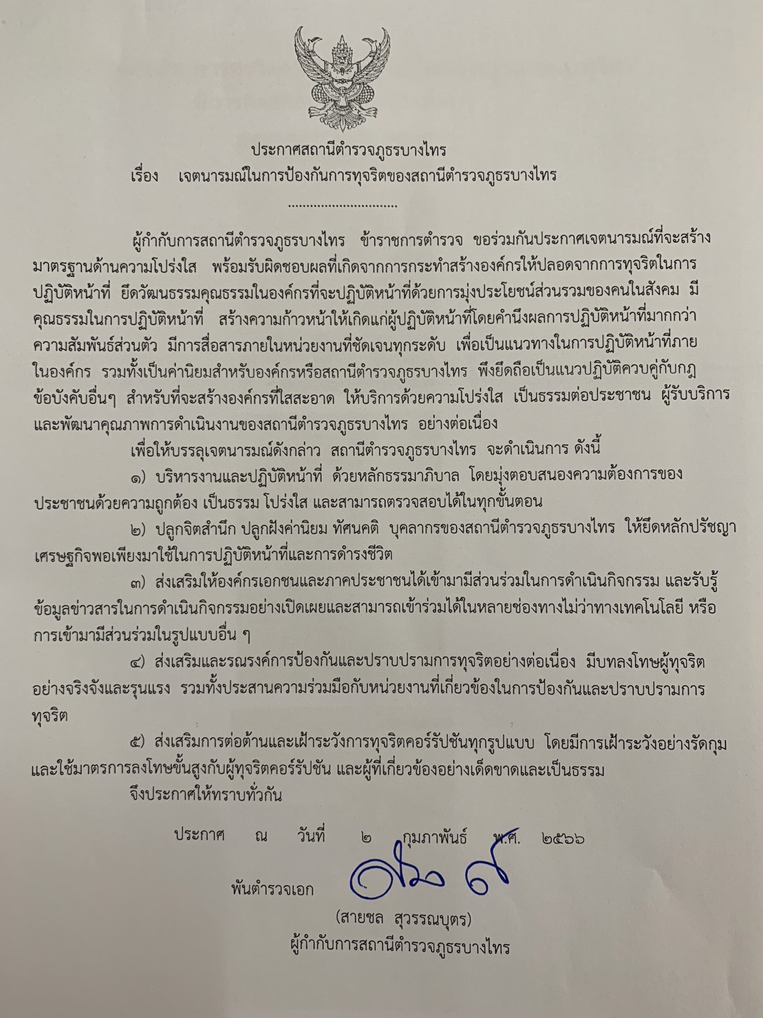เจตนารมณ์ในการป้องกันการทุจริตของสภานีตำรวจภูธรบางไทร โดย พ.ต.อ.สายชล สุวรรณบุตร ผู้กำกับการสถานีตำรวจภูธรบางไทร